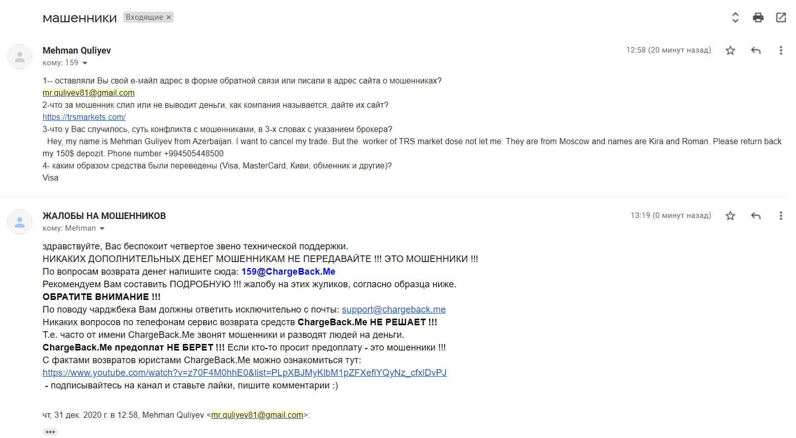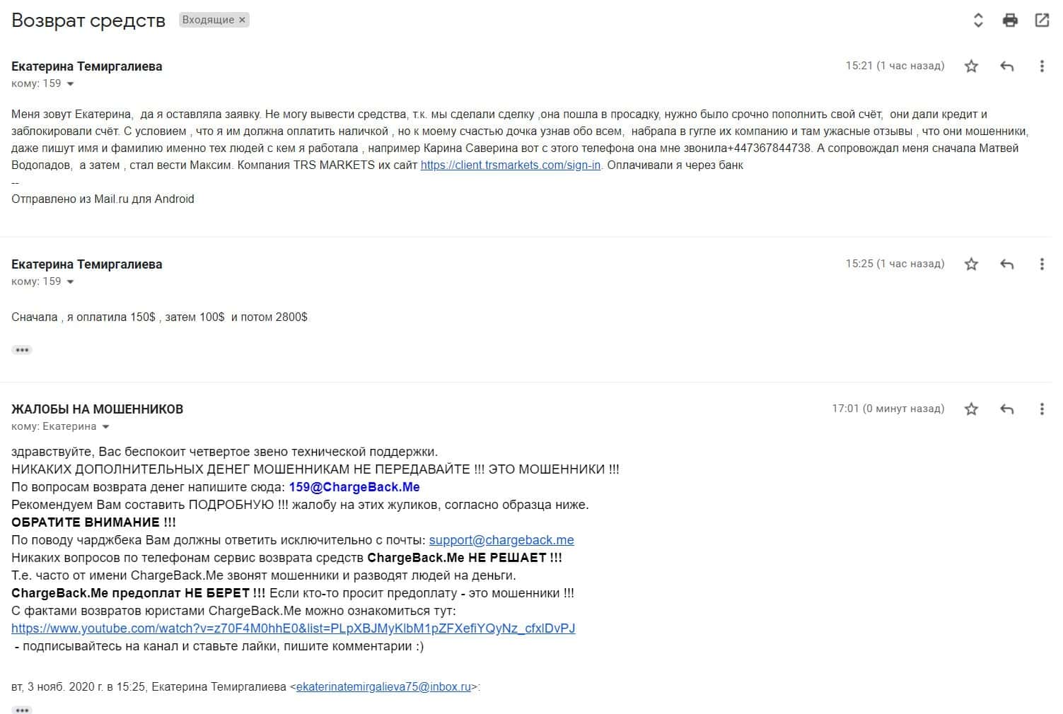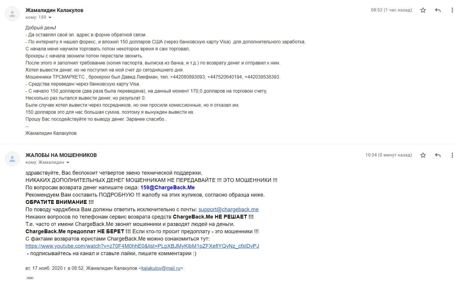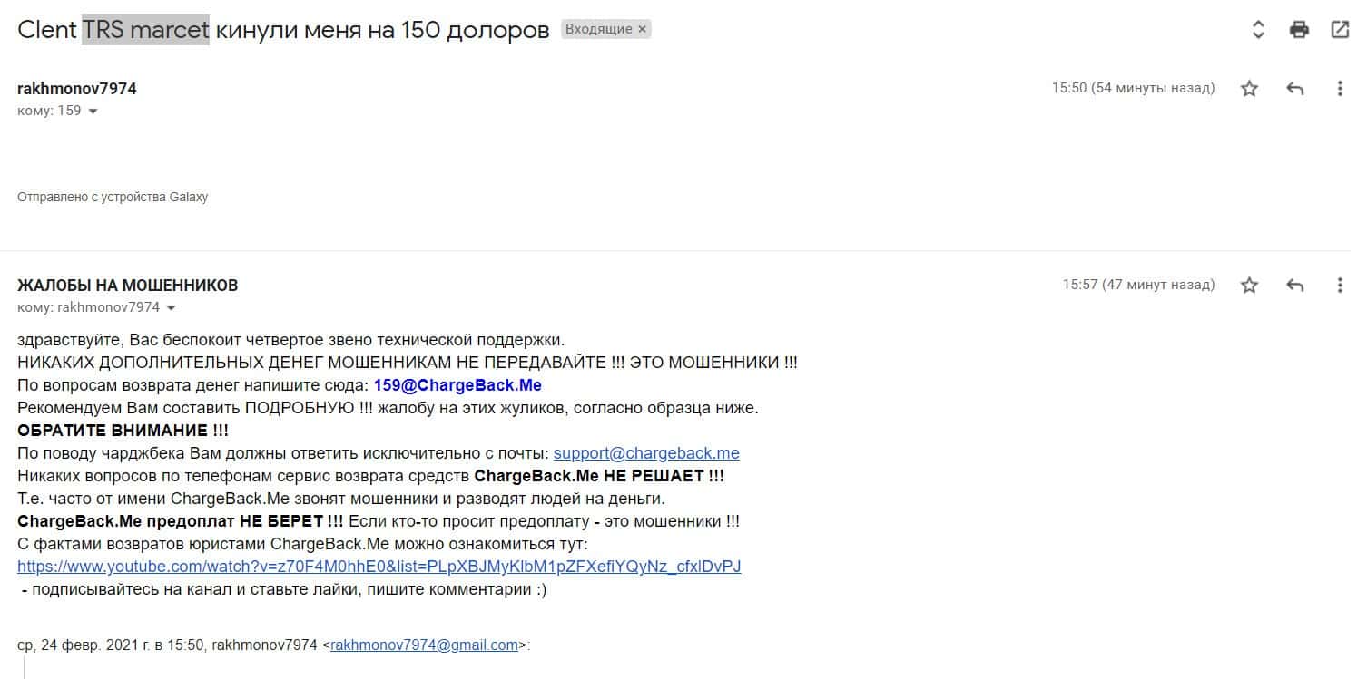 Жалоба обманутого пользователя, который пострадал от кидал ТРС Маркетс на 150 долларов