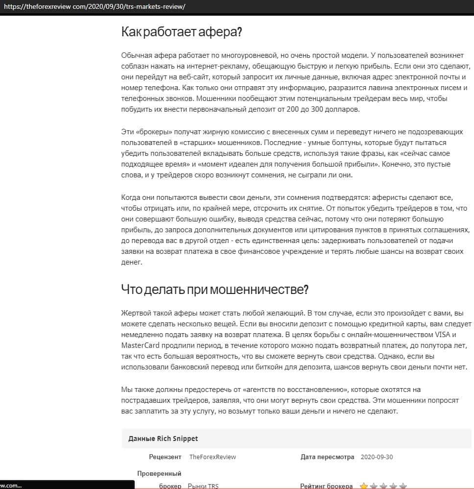 - Статьи о мошенниках ТРС Маркетс в сети интернет