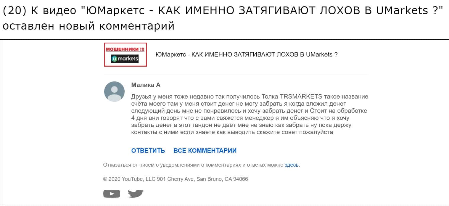 Далее предлагаем увидеть комментарий человека, который столкнулся с мошеннической компанией ТРС Маркетс, данный пост был оставлен им под видео о лохотроне Юмаркетс.