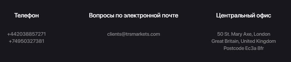 Ниже представлены контактные данные аферистов ТРС Маркетс, где указан адрес регистрации, несколько номеров телефона и электронная почта. Вот собственно данные: