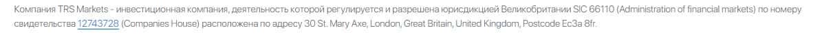 Лохотронская контора TRSMarkets указала на сайте, что имеет регистрацию на территории Великобритании, но данная информация может быть обыкновенным фейком.