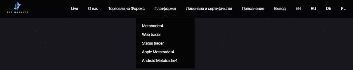 Контора ТРС Маркетс предлагает клиентам пользоваться торговой платформой Мета Трейдер 4 (является частью MetaQuotes), которая уже известна всем как платформа для лохов.