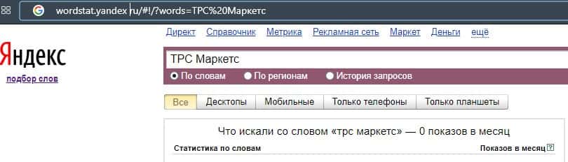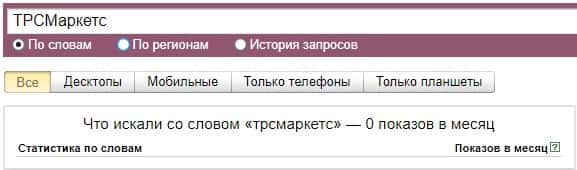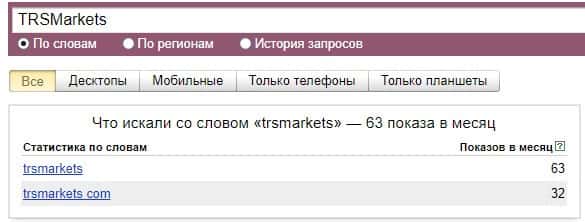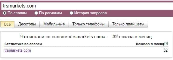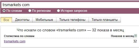 Запрос бренда "trsmarkets com" по версии Яндекс.Вордстат нашел 32 показов в месяц, что показывает их очень низкую популярность в интернете.