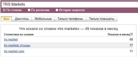 А вот бренд "TRS Markets" оказался также популярным и был запрошен всего 49 раз в поисковую систему Яндекс. Это показывает реальную популярность лохотрона.
