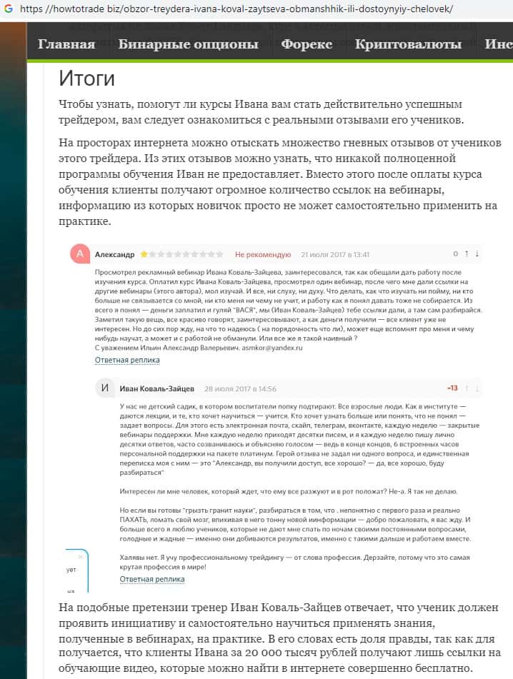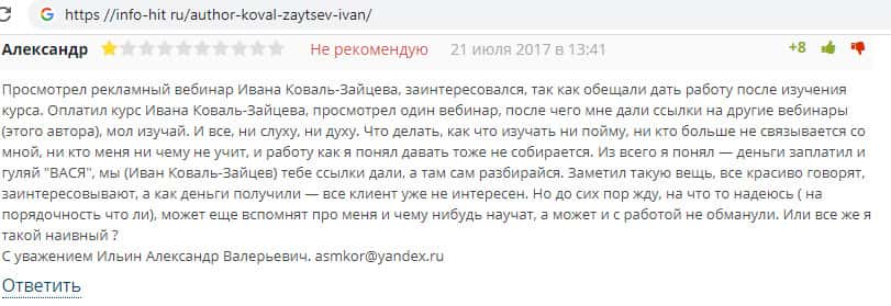 На нижеуказанном изображении можно прочесть разгневанный отзыв одного из форекс трейдеров, который приобрел курс Ивана Коваль-Зайцева, так как после прохождения обучающего курса по трейдингу обещали предоставить работу. В итоге, после оплаты курса мужчина не увидел ни работы, ни даже настоящего обучения.