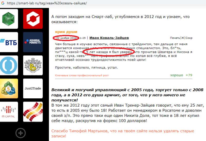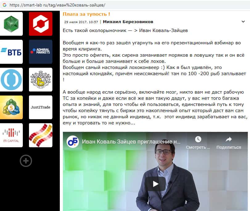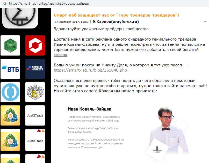 Начинается обзор на уважаемом веб-портале smart-lab ru с того, что сотрудники пытаются раскрыть всю правду для потенциальных трейдеров, кто рискнет вложить свои средства или пройти обучение на платформе мошенника Ивана Коваль-Зайцева, который собирая людей , просто-напросто внаглую им лжет об успешном брокерском проекте TrueTrading.