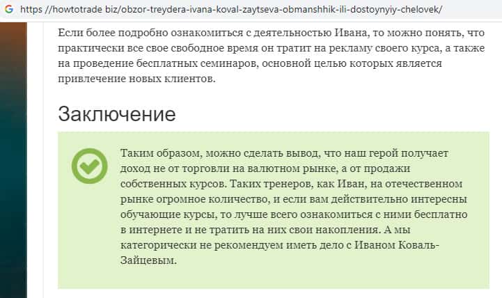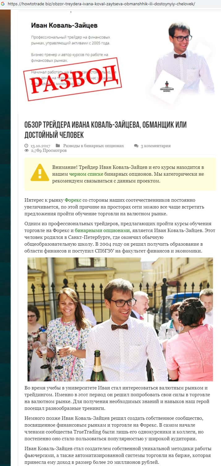 При исследовании, проводимом известным интернет-ресурсом howtotrade biz, стало известно, что жульнический трейдер Иван Коваль-Зайцев совместно со своими махинаторскими курсами находится в черном списке бинарных опционов. Руководство данного портала категорически не рекомендует связываться с данным лохотронским брокерским проектом.