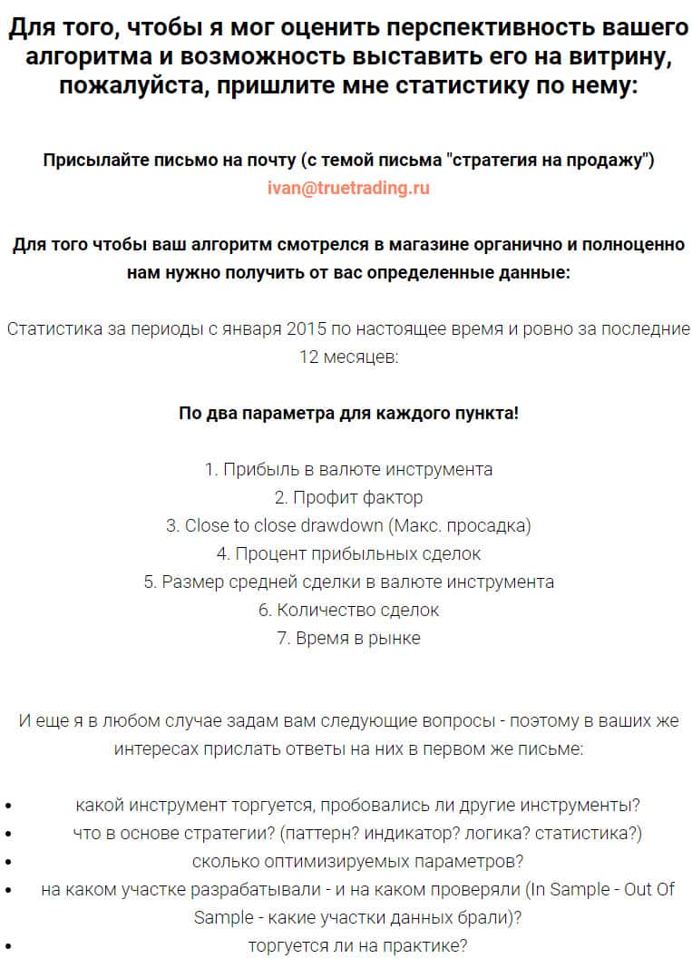 Что касается партнерской программы на веб-портале афериста-брокера TrueTrading, то основатель данного шулерского проекта обещает потенциальным вкладчикам, кто желает выгодно продать собственную стратегию предоставить целый перечень данных. Но все эти данные могут легко позволить сотрудникам форекс кухни украсть эту идею у клиента.