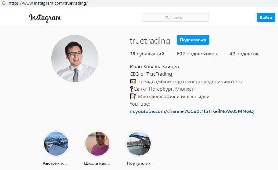 Что касается следующей социальной сети Инстаграм, которая является одной из наиболее популярных социальных сетей во всем мире, то количество подписчиков основателя шарашкиного проекта Ивана Коваль-Зайцева насчитывает всего 602 подписчика, что является каплей в море для такой сети. Адрес аккаунта instagram com/truetrading/