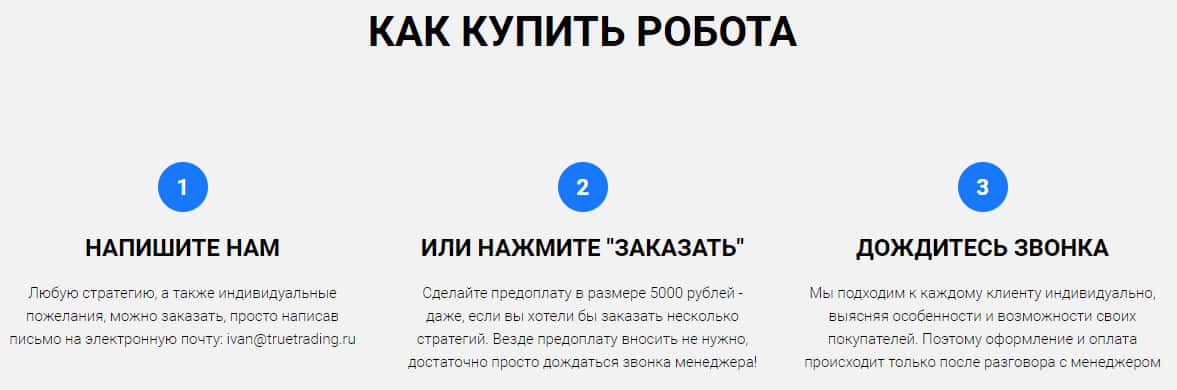 Следующий раздел аферной интернет-площадки форекс кухни TrueTrading посвящена покупке роботов. Сотрудники надувательской брокерской организации придумали еще одну замануху, чтоб ограбить несчастных валютных игроков. Они сообщают, что можно заказать себе в помощь для торговли на рынке валют Форекс непревзойденного помощника в виде робота.