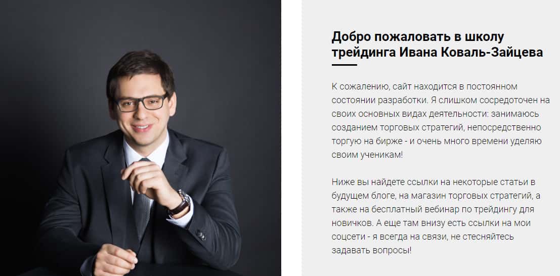 Начинается шулерский веб-сервис аферного форекс брокера TrueTrading с большого фото автора данного проекта Ивана Коваль-Зайцева и его краткого рассказа о своих задумках по поводу трейдинга. Он написал, что сайт находится в постоянном состоянии разработки, так как он якобы уделяет много времени ученикам разработке стратегий. Но на деле - лохотрон с огромными амбициями.