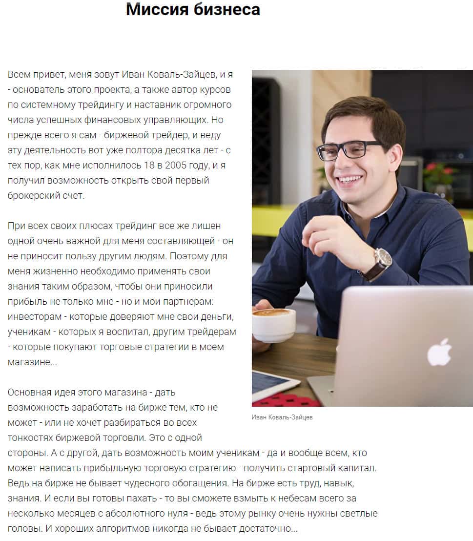 Далее, продвигаясь по жульническому сайту шараги Тру Трейдинг, попадает в раздел "Миссия бизнеса", в котором основатель проекта сообщает о том, что главная идея этого магазина - дать возможность заработать на бирже тем, кто не может или не хочет разбираться во всех тонкостях биржевой торговли. А на самом деле обычная ширма для афер мошенника.