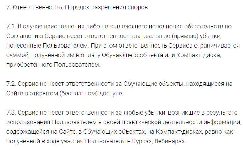 В седьмом разделе "Ответственность и порядок разрешения споров" мошенники из форекс кухни Тру Трейдинг снимают в каждом пункте договора с себя всю ответственность перед своими форекс игроками. Например, ворюги не несут никакой ответственности за любые убытки, возникшие в результате использования их обучающей стратегии.