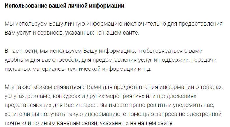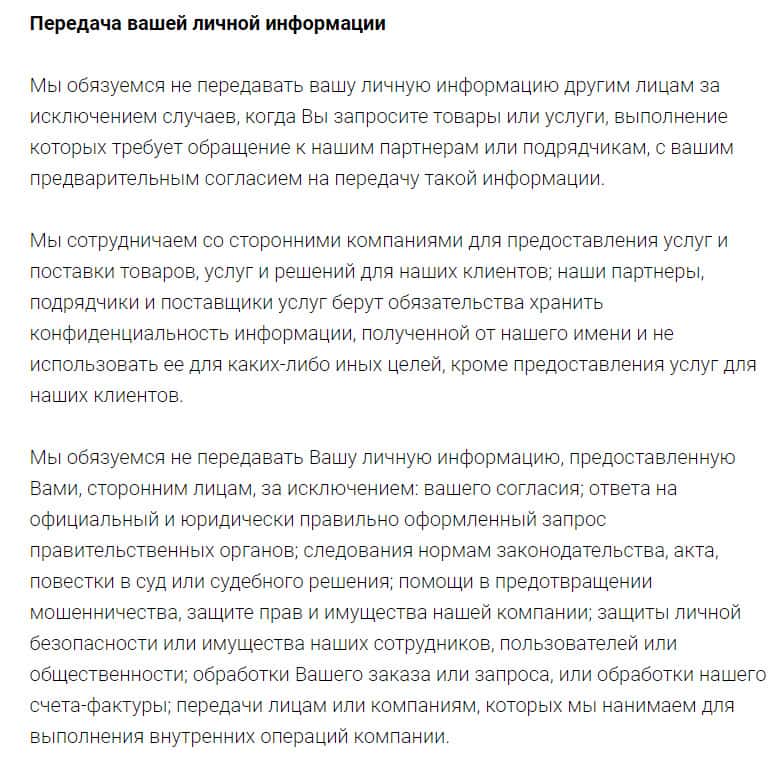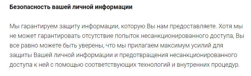 В еще одном разделе политики конфиденциальности "Передача вашей личной информации" говорится о том, что каждый валютный трейдер может не беспокоиться за безопасность и сохранность его личных данных. Но вся проблема в том, что все, что написано в данной разделе - сплошное вранье для запудривания мозгов наивным клиентам.