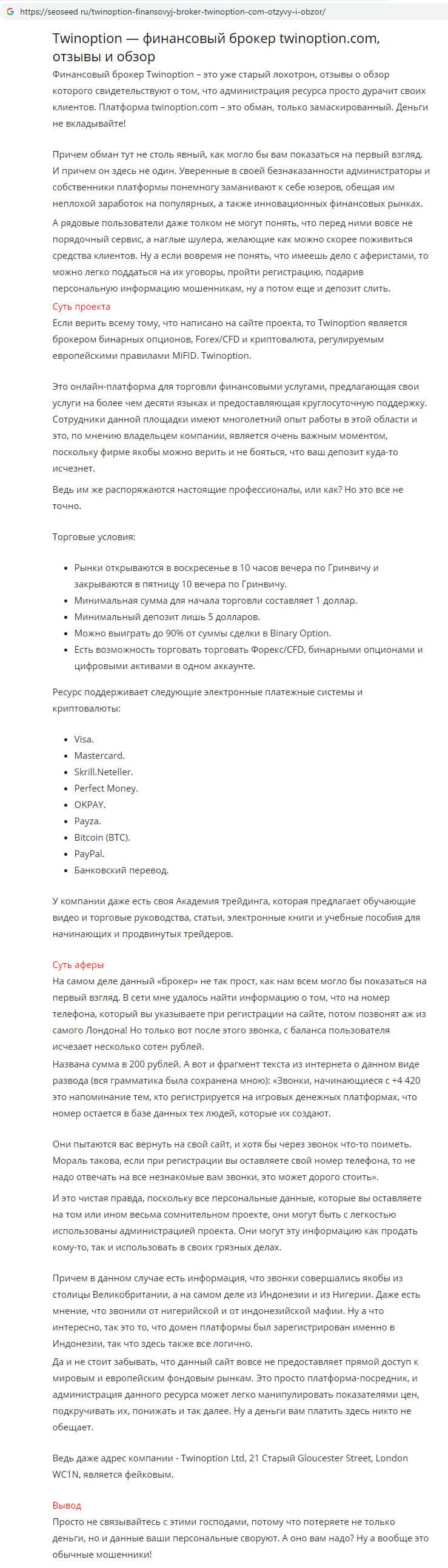 - Очередная статья-отзыв о скам-брокере Твин Опцион найдена в глобальной сети seoseed ru