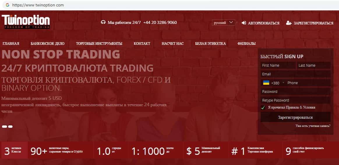 Сайт мошеннической организации Твин Опцион на английском языке. Сайт конечно же можно переводить на любые языки, но сильно Вам это не поможет, поскольку информация на сайте жуликов Твин Опцион переводится лишь частично, а регистрационная форма и документы все так же остаются на английском языке.