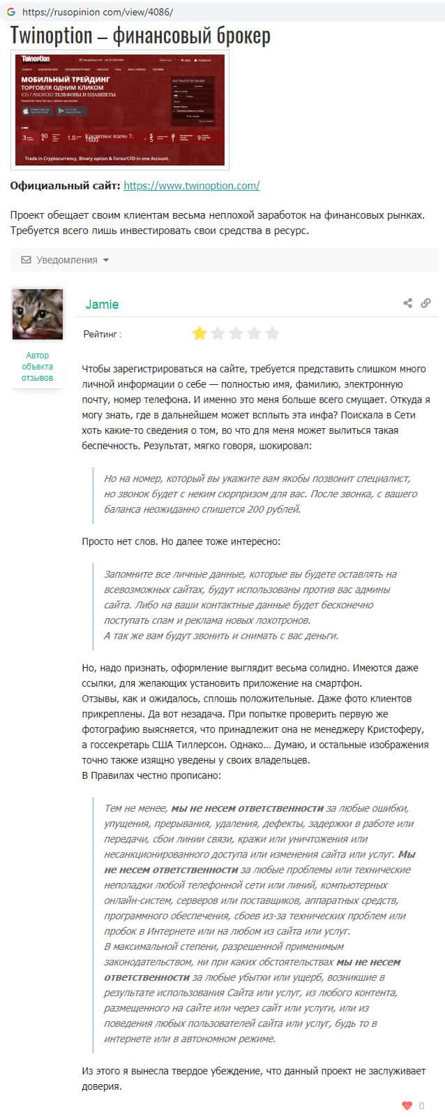 - Отзыв некого Jamie на интернет-портале rusopinion com о мошеннической организации Twin Option