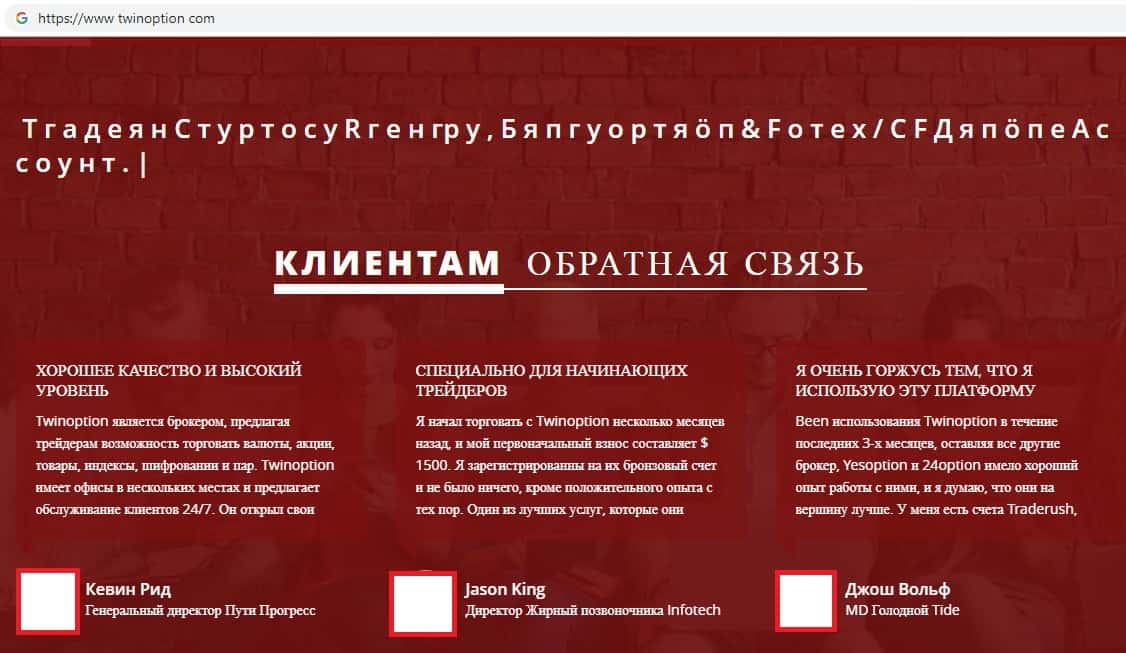Далее на сайте конторы Твин Опцион специально для наивных и доверчивых клиентов написаны какие-то фразы, которые якобы цитируют руководство компании Твин Опцион, а именно генерального директора, менеджера, аналитиков и остальных воображаемых героев сказки под названием Твин Опцион.