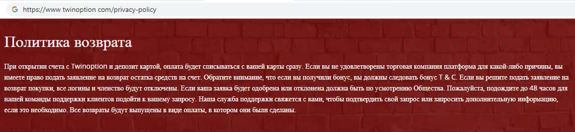Так же жульническая компания Твин Опцион указывает информацию о политике возврата средств. Служба поддержки сайта скам-конторы Твин Опцион обещает связаться с клиентом желающим вернуть свои денежные средства в течении 48 часов. При этом жулики Твин Опцион станут запрашивать дополнительную информацию, например копию паспорта.