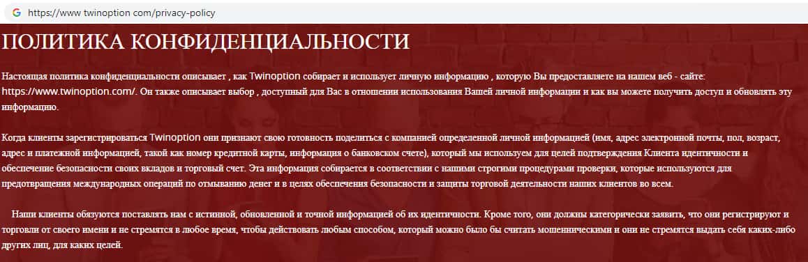 Политика конфиденциальности скам-брокера Twin Option