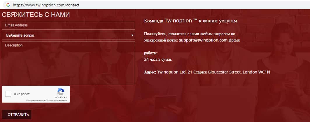 Жулики Твин Опцион оставили о себе информацию о месте регистрации, а так же адрес электронной почты. Контора Твин Опцион зарегистрирована в Лондоне. Адрес электронной почты, а так же контактный номер телефона мошеннической организации Твин Опцион представлены ниже: