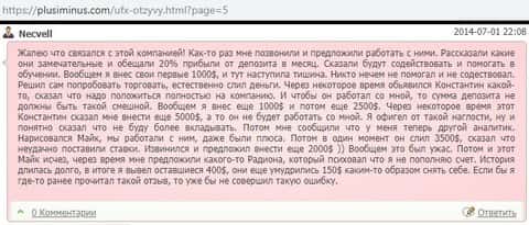 В один роковой день человек пожалел, что связался с брокерской конторой ЮФХ. Звонари нашли его контакты и начали обрабатывать по полной программе: говорили какие они прекрасные и обещали 20% прибыли от вклада. Человек повелся на эту лапшу и завел свой первый депозит в 1000 долларов. Но в торговле никто не помогал и клиент сам удачно слил свой депозит, так как был не опытен. После инцидента позвонил Константин и пообещал, что будет помогать если он еще раз пополнит депозит. Так на их счет ушло еще 3500 долларов, но Костя не останавливался и раз дело так пошло, то он вымогал еще 5000 долларов. Но клиент начал подозрительно ко всему относиться и отказался. Константин отказался от предоставления помощи и передал его в лапы нового аналитика Майка. Этот парень быстро слил все деньги и стал просить еще 2000 долларов. Короче развели по полной и жертва обмана еле унес ноги.