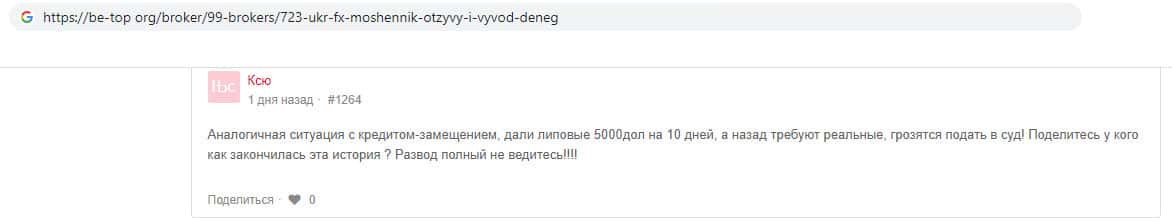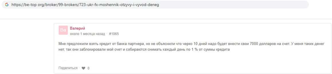 В данном отзыве пользователь раскрыл схему мошенников Укр ФХ. Они предлагают клиенту взять кредит, для того, что бы увеличить прибыль, но потом сразу замораживают счёт, а для того, что бы его разморозили нужно внести сумму равную кредиту, где то 5 - 7 тысяч долларов. Но если вы их внесёте, то и этих денег вам не видать.