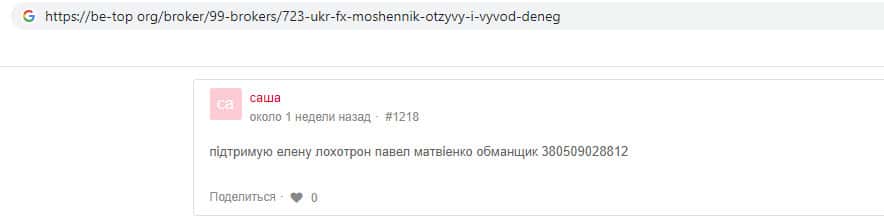 Некий "Саша" написал отзыв, в котором поддерживает жалобу на лохотрон Укр ФХ, и подтверждает, что компания действительно жулики. Так же он упоминает менеджера Павла Матвиенко, которого называет обманщиком. Видимо этот некий Павел и развёл данного пользователя, и вытянул из него немалую сумму денег.