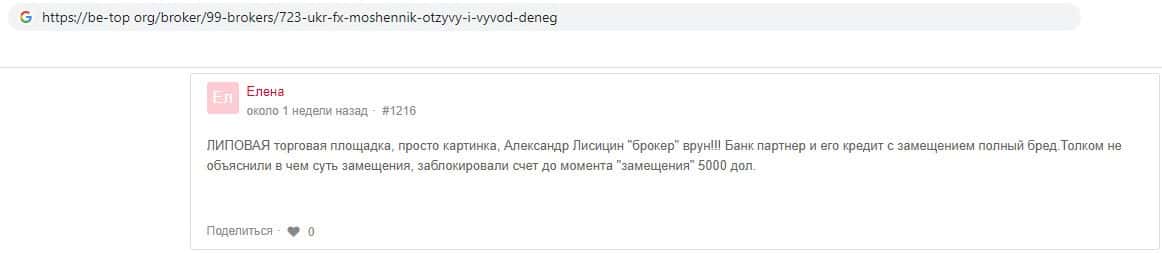 В своём отзыве некая Елена назвала компанию Укр ФХ - липовая торговая площадка. Ещё она упомянула менеджера Александра Лисицына, называя его вруном. Так же она замещает, что банк, который сотрудничает с фирмой и его система замещения это полный бред. Компания ничего не объяснила и заблокировала аккаунт клиента.