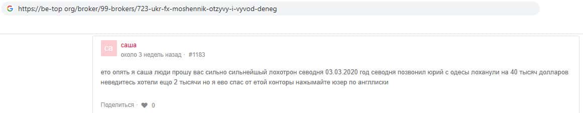 В данном отзыве, всё от того же пользователя "Саша" мы видим как он пытается бороться с мошенниками UkrFX Pro. Он всячески старается распространить информацию о мошенничестве компании, а так же сообщает, что будет распространять её на фейсбуке, и клиенты компании которые увидят эту информацию будут ему очень благодарны.