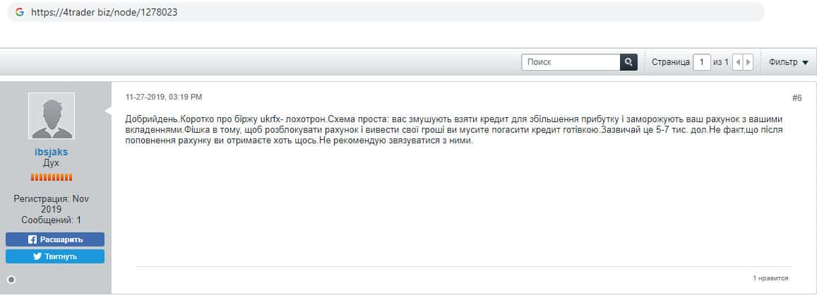 - Пользователь распространяет информацию о мошенниках UkrFX Pro на фейсбуке