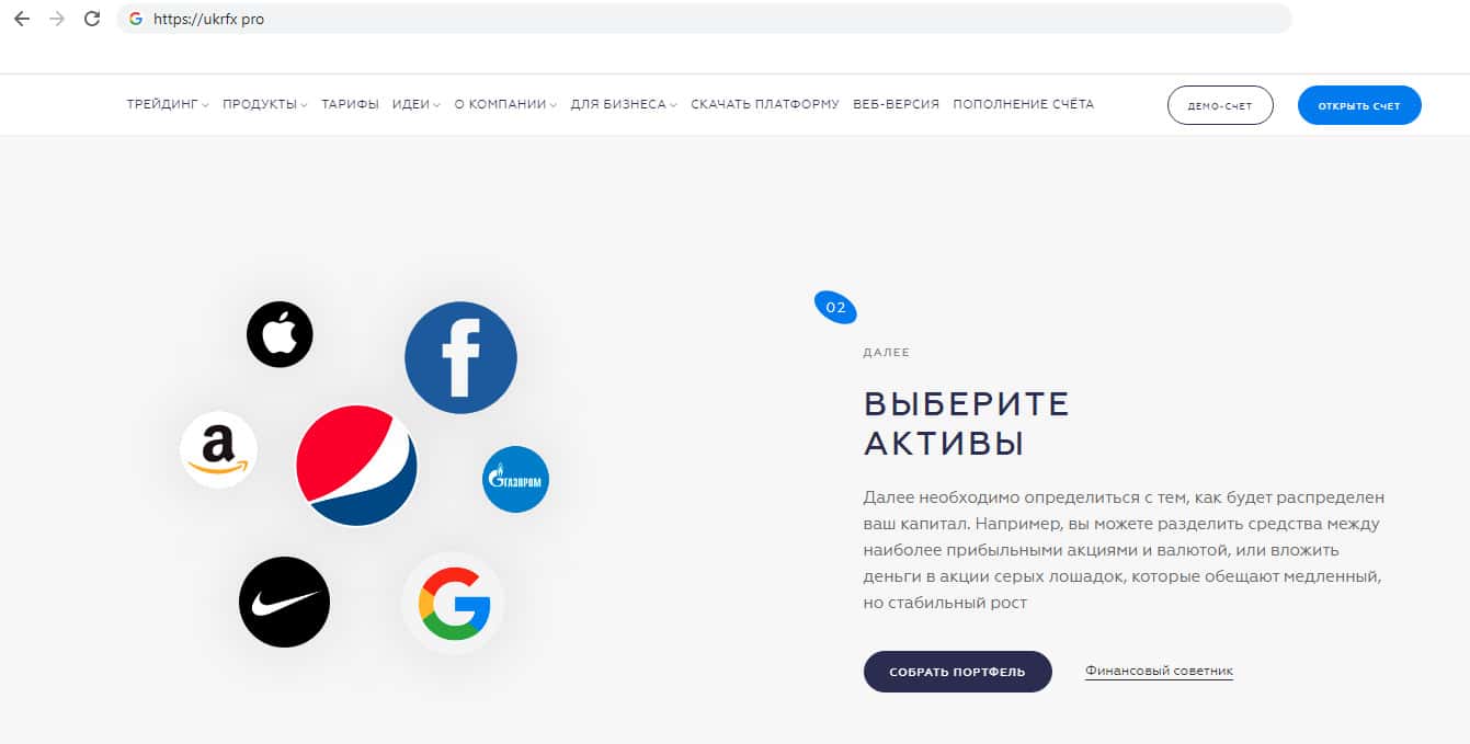 Следующим пунктом компания демонстрирует активы. Жулики предлагают клиенту выбрать активы, или разделить капитал между прибыльными акциями и валютой, или же вложить всё в серых лошадок, которые дадут медленный но стабильный доход. Но куда бы клиент не вложил средства, фирма кидал Укр ФХ всё равно оставит их себе.