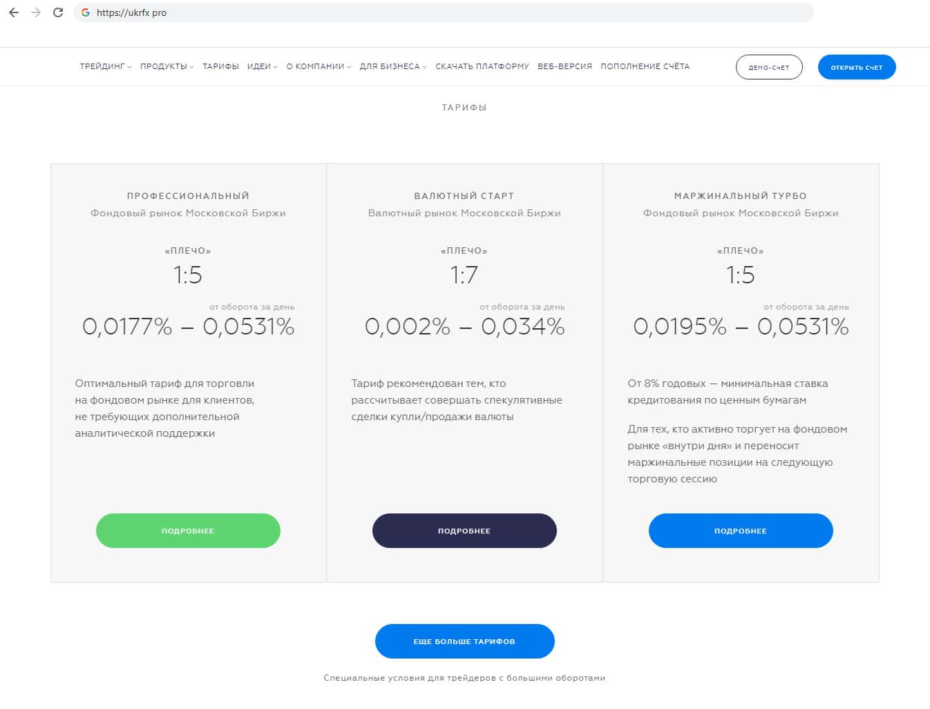 Лжеброкер Укр ФХ представил три вида тарифов для клиентов. Первый - профессиональный, для для клиентов, не требующих дополнительной аналитической поддержки, второй - валютный старт, для тех, кто рассчитывает совершать спекулятивные сделки купли/продажи валюты, и последний - маржинальный турбо, для Для тех, кто активно торгует на фондовом рынке «внутри дня».