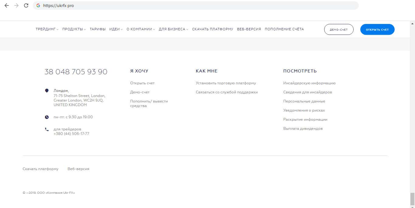 Недоконтора Укр ФХ указала контактную информацию, в которой почему то отсутствует адрес электронной почты. Указаны только номера телефонов, и адрес офиса в Лондоне, что странно, ведь компания Украинская, а офис в Лондоне, и мало кто полетит в Англию для того, что бы проверить офис. Контакты недоконторы: