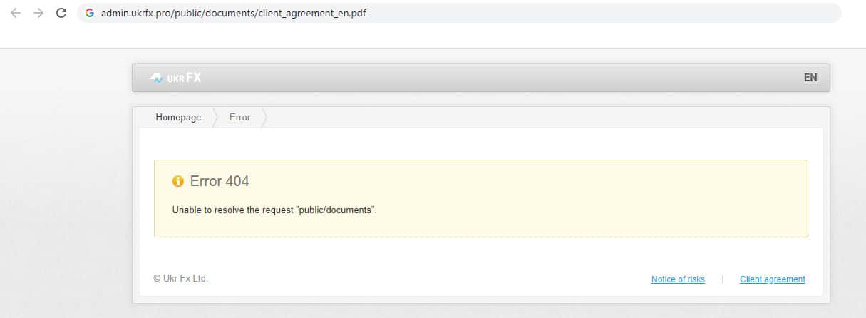 При регистрации вам предлагают согласится с уведомлением о рисках и клиентским соглашением. Но если пользователь нажмёт на эту кнопку и захочет ознакомится с этими документами, то выдаёт ошибку, то есть фирма не даёт ознакомиться с документами до регистрации на фирме.