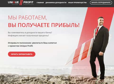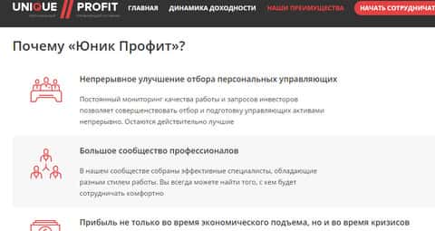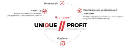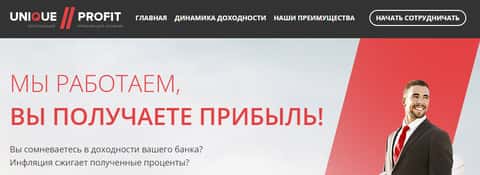 Начинается сайт у лохотрона Ю Профит с довольно стандартной и типичной шапки сайта, в которой у мошенников Unique Profit находится типичная лапша на уши под предлогом описания деятельности подвального сайта жуликов Ю Профит, под предлогом которых аферисты Unique Profit будут пытаться развести клиентов. Ниже вы можете увидеть шапку сайта лохотрона Ю Профит.