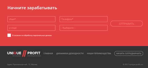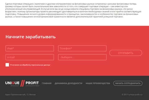 Завершается сайт у аферистов Unique Profit довольно стандартно и ожидаемо, а именно формой для регистрации нового наивного клиента, ссылками на различные разделы подвального сайта мошенников Ю Профит, а так же предупреждением о рисках, в котором аферисты Unique Profit предупреждают наивных пользователей о возможной вероятности слива денег.