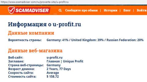 В связи с мошеннической и противозаконной деятельностью реальные руководители мошенников Ю Профит предпочитают анонимность дабы избежать ответственности со стороны правоохранительных органов. Информацию о самом же сайте лохотрона Unique Profit можно узнать с помощью портала scamadviser com, которую вы можете увидеть на изображении, расположенном ниже.