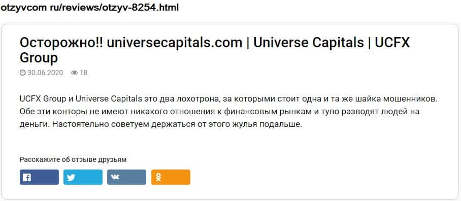 На ресурсе otzyvcom ru отследили связь мошенников Универс Капиталс с другим лохотроном UCFX Group, за которым стоят те же аферисты.