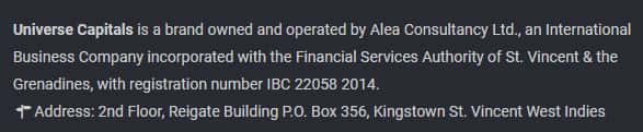 UniverseCapitals по точному адресу: 2nd Floor, Reigate Building P.O. Box 356, Kingstown St. Vincent West Indies.