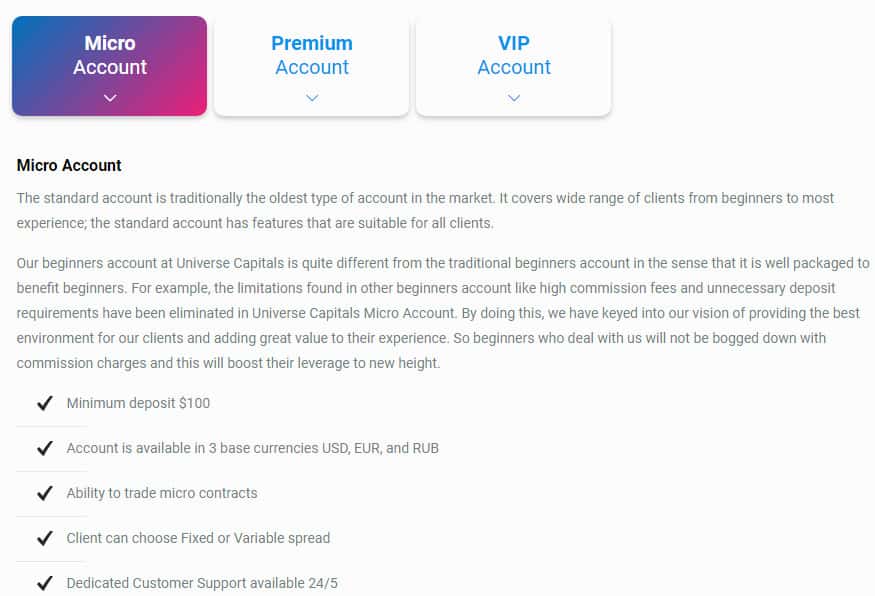 По типу счетов у Универс Капиталс сразу можно понять, что перед нами самая обычная кухня, потому что с минимальным депозитом в 100$ не стоит говорить о торговле.