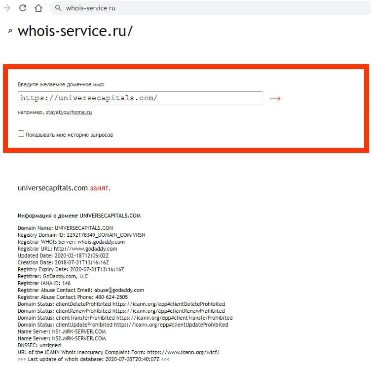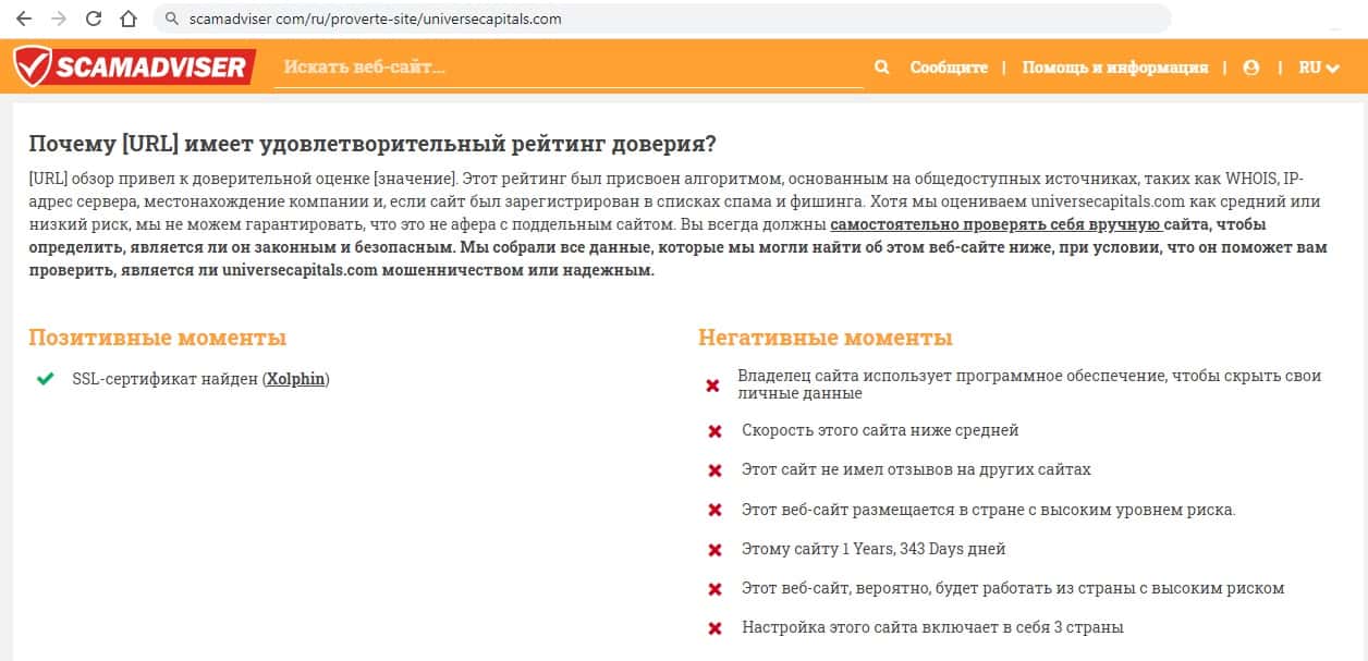Проверка ресурса мошеннической конторы UniverseCapitals на сайте скамадвайзер ком показала, что риск высокий и владелец скрывает личные данные.