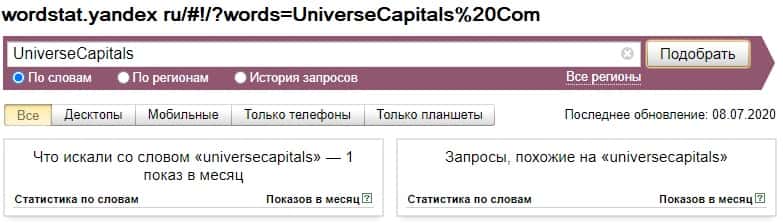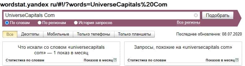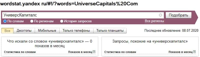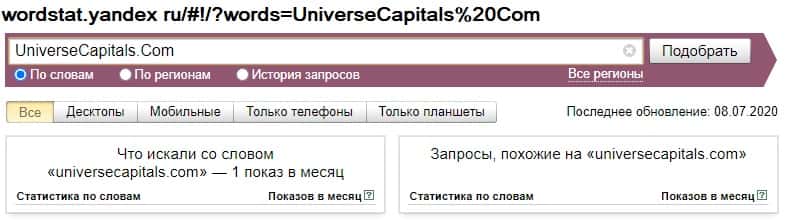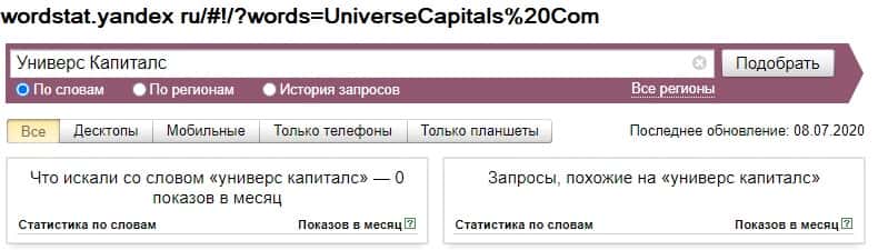 По названию данного лохотрона Универс Капиталс на русском языке без пробела в виде "УниверсКапиталс" на Яндекс Вордстат тоже составил 0 раз.