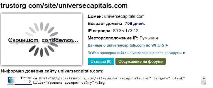 Анализ конторы UniverseCapitals на сайте ТрастТорг Ком показывает, что домен мошенников существует уже 709 дней. Понятно, что они успели кинуть уже много людей.