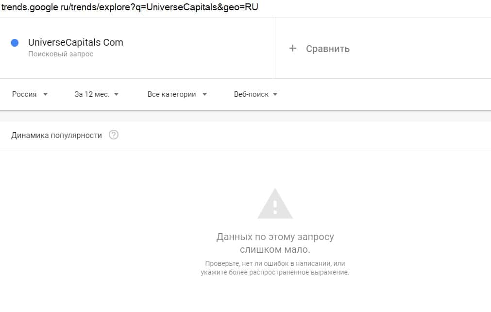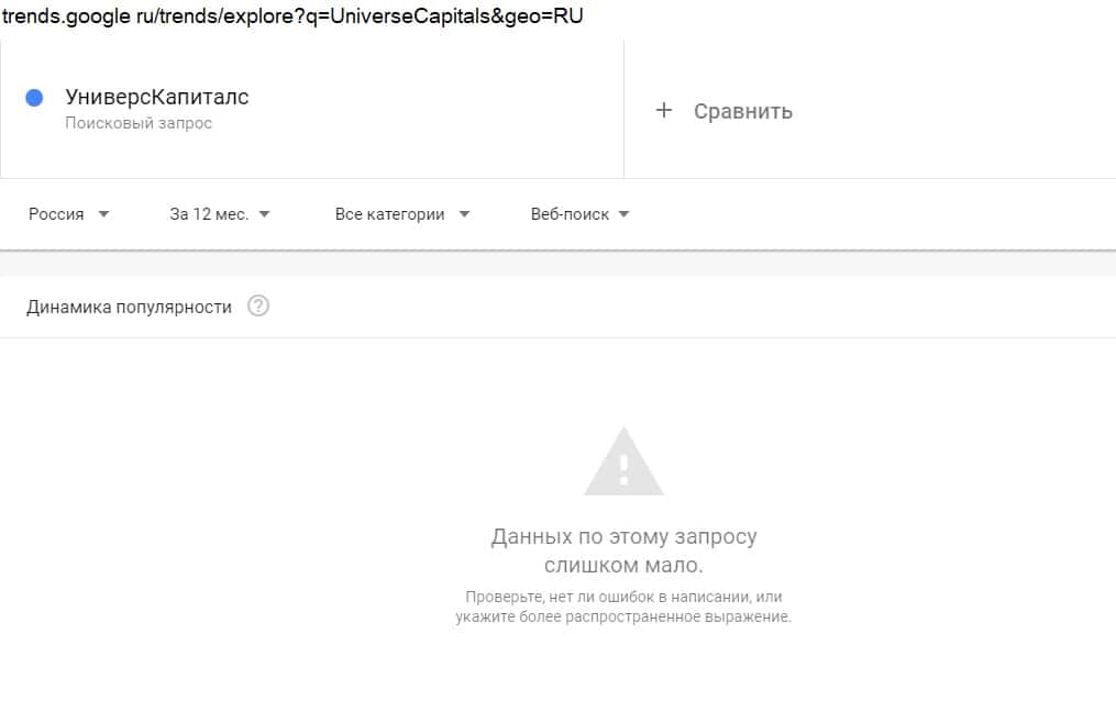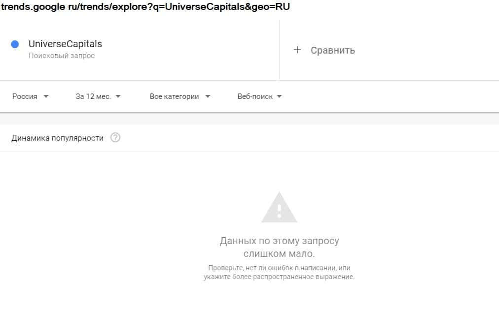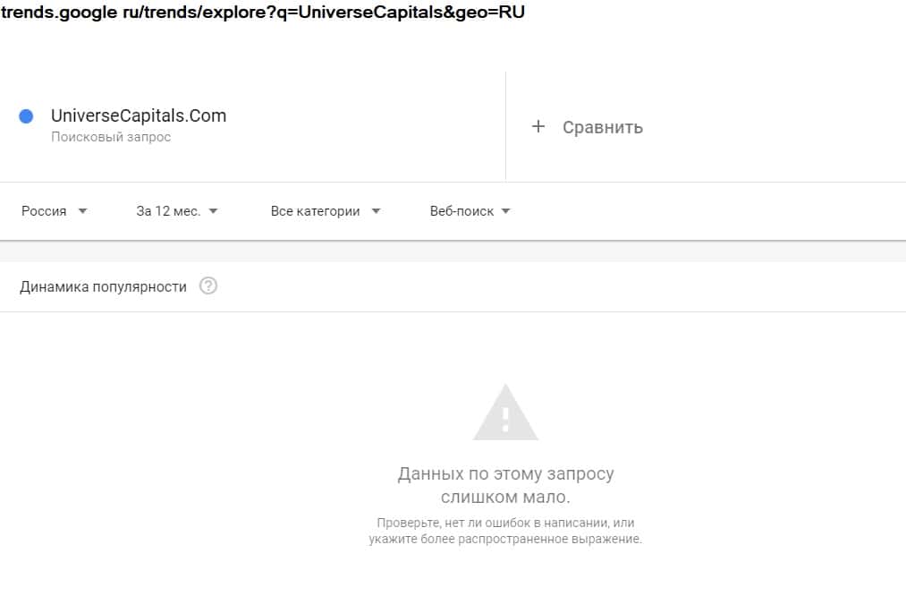 В поисковой системе Гугл, лохотрон UniverseCapitals вообще не имеет никакой популярности и количество поисковых запросов там равна нулю, информация по запросам отсутствует.