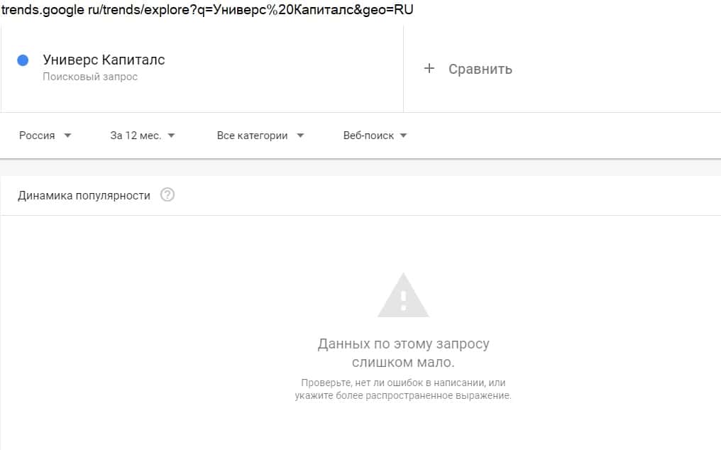 Теперь после просмотра количества запросов по лохотрону на английском языке, перейдем к названиям на русском, первый из которых "Универс Капиталс".