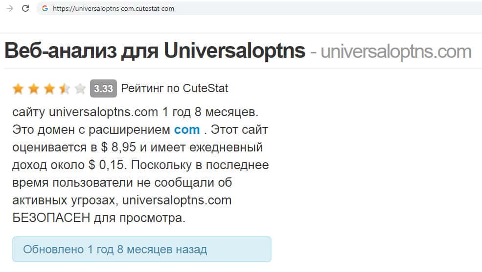 На сайте cutestat com нам удалось найти информацию о компании соскамившихся аферистов UniversalOptns. Эта информация была собрана ещё когда компания работала, и судя по ней фирма явно занималась мошенничеством, так как сайт рабочей компании оценивался менее 9 долларов, а ежедневный доход сайта составлял 15 центов.