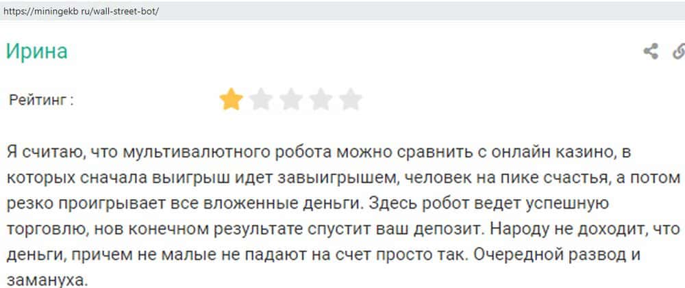 Пользователи сравнивают скам-бота Уолл-стрит Бот с казино. Понятно, что никто не может гарантировать высокого стабильного заработка на ставках на валютные пары, это невозможно.