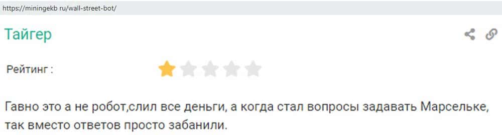 После того как недопрограмма Уолл-стрит Бот сливает деньги, жаловаться бесполезно. Разводилы-создатели резко перестают быть общительными и просто игнорируют жертву.