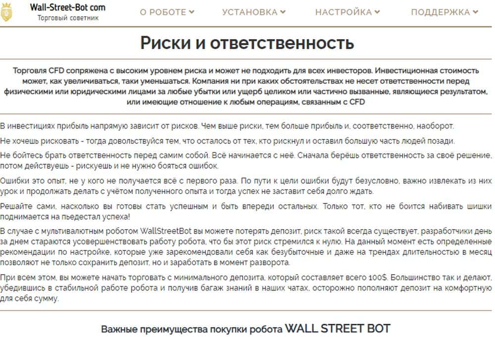 К сожалению, многие ведутся на басни о том, что успех только для тех, кто не боится рисковать. Они покупают фиктивного бота и попадают в лапы мошенников Уолл-стрит Бот.